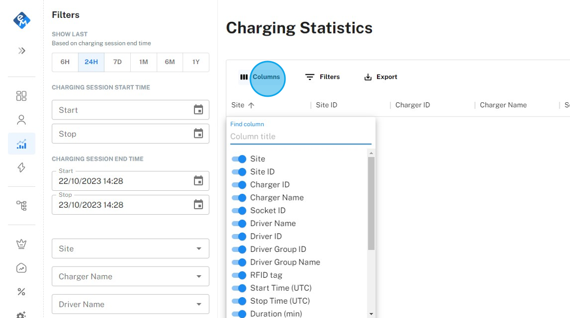 3. You can change which columns are visible on the table and on the data export by clicking "Columns" and selecting the columns you want.