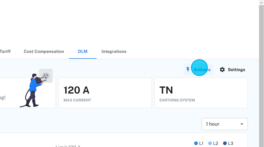 4. After initial configuration if all your chargers are available, you can activate the DLM. Click "Activate" to set DLM active. After DLM has been activated, you can see the status of the individual sockets below. Total amperage used by the DLM site is also visible.