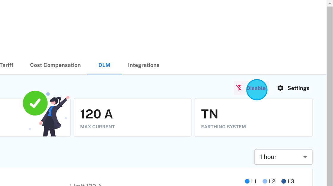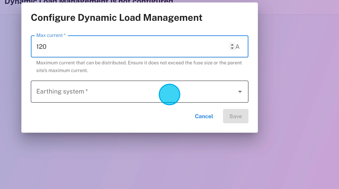3. Set the Max current and Earthing system for your DLM configuration. Make sure that the Max current doesn't exceed available fuse capacity.